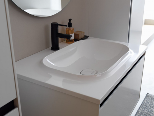 Просторна фиока со тивок систем на затворање сместена под импресивно дизајнираниот мијалник.